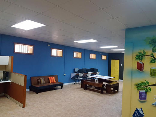 With the kind assistance of Children's Ark, Wishing for Wings set up a library where death row cells used to be located. Inmates tore out the cells, Children's Ark refurbished the area, librarian and fashion desinger Ijanaya Jacob came up with the design for the library and a reading area where inmates can read to their children. The artists located at Carrera, implemented Ijanaya's designs in an area, where they once served time in those death row cells before being sent to Carrera.